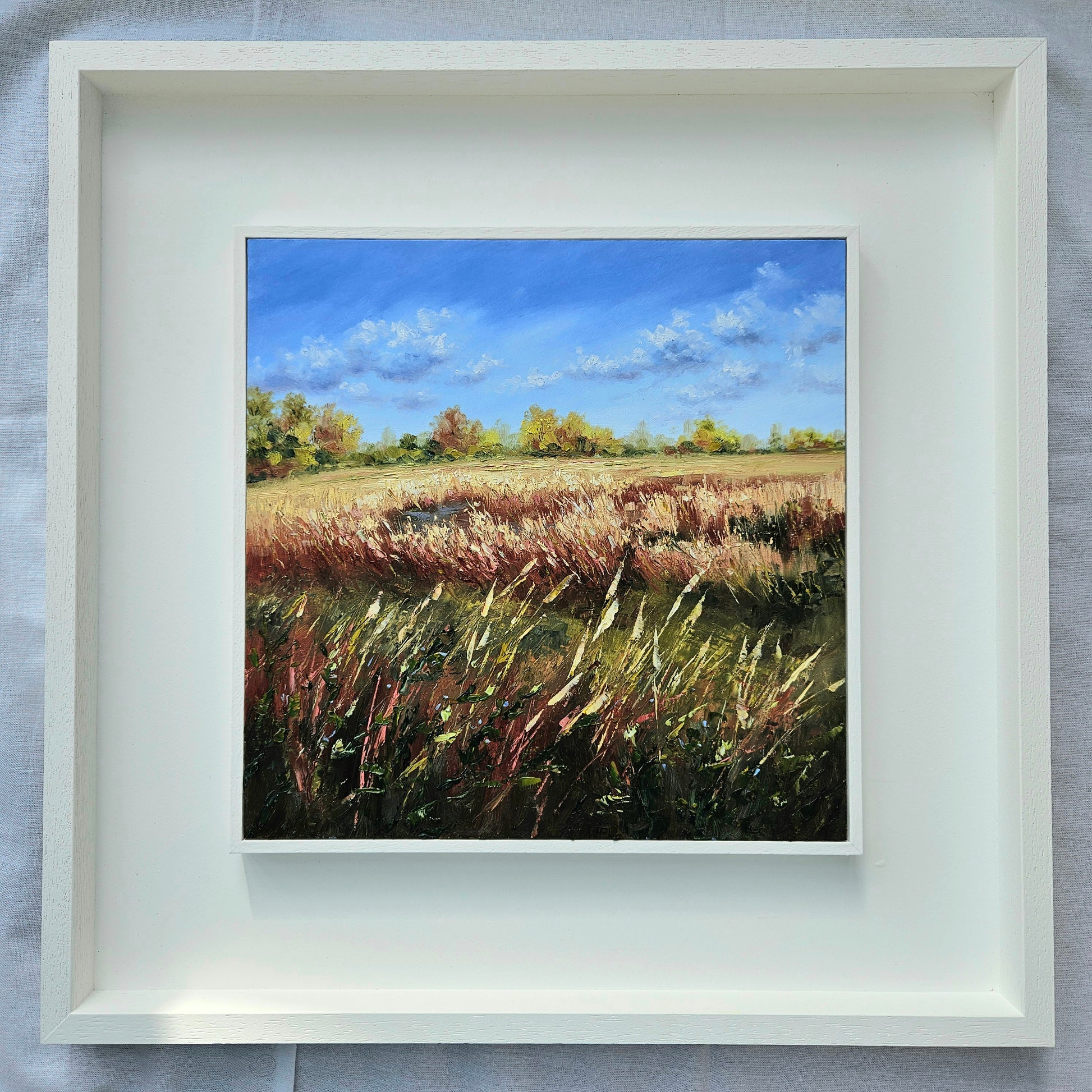 12x12 inches (30x30 cm), oil on board, framed in bespoke white wood frame, signed verso, ready to hang.