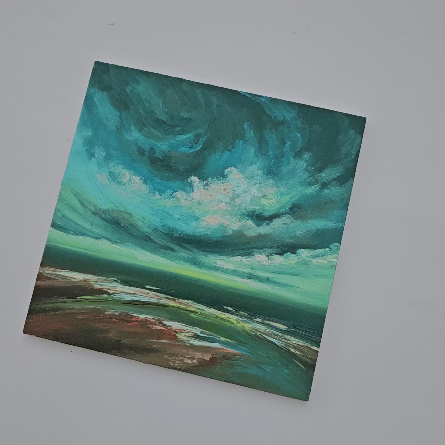 A sky full of energy, a sea about to be stirred as it turns tide, in shades of teal.